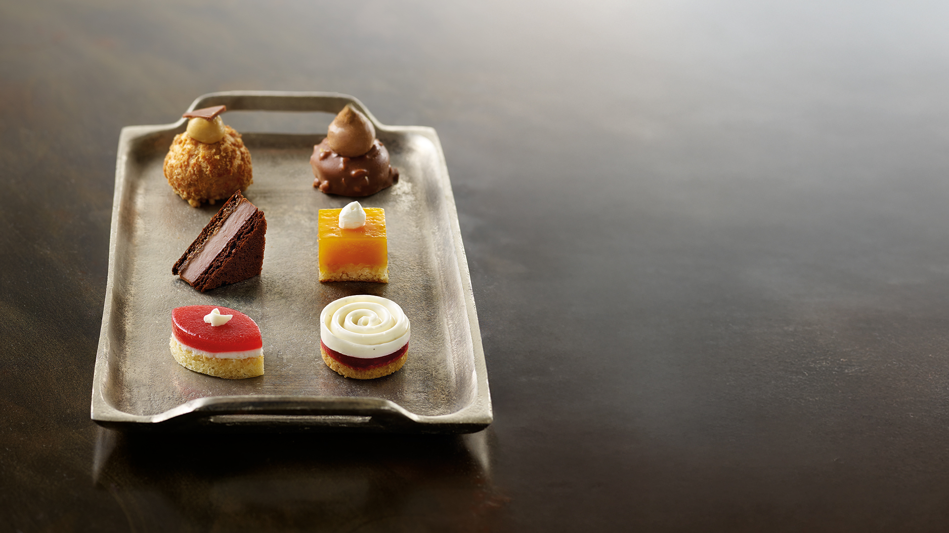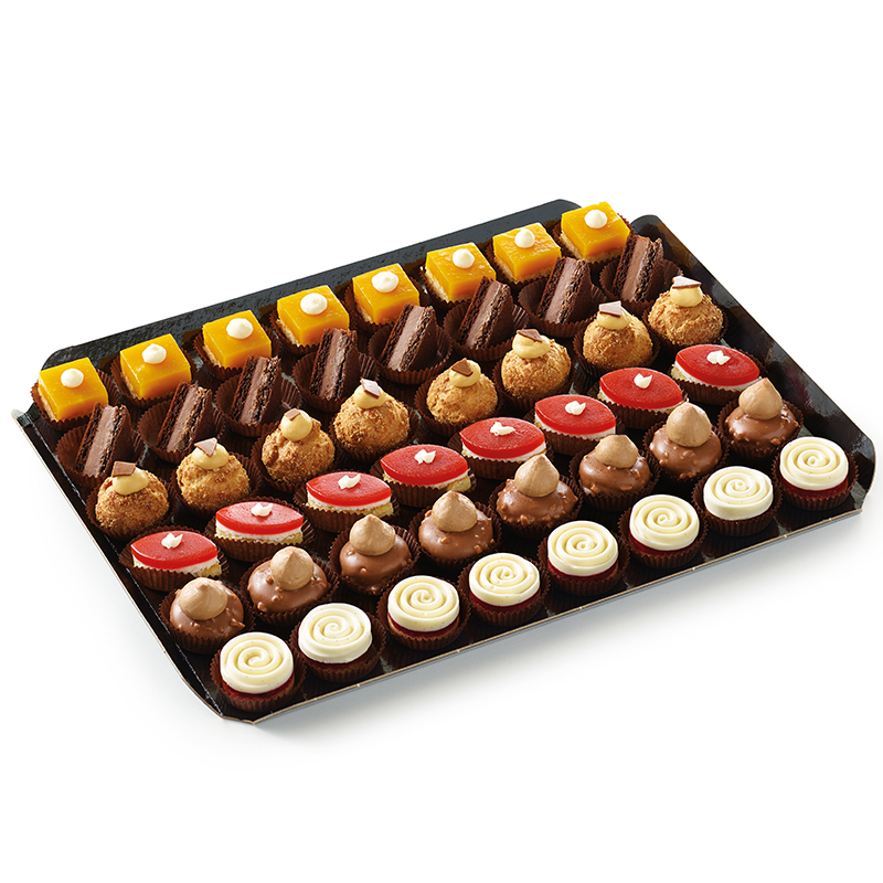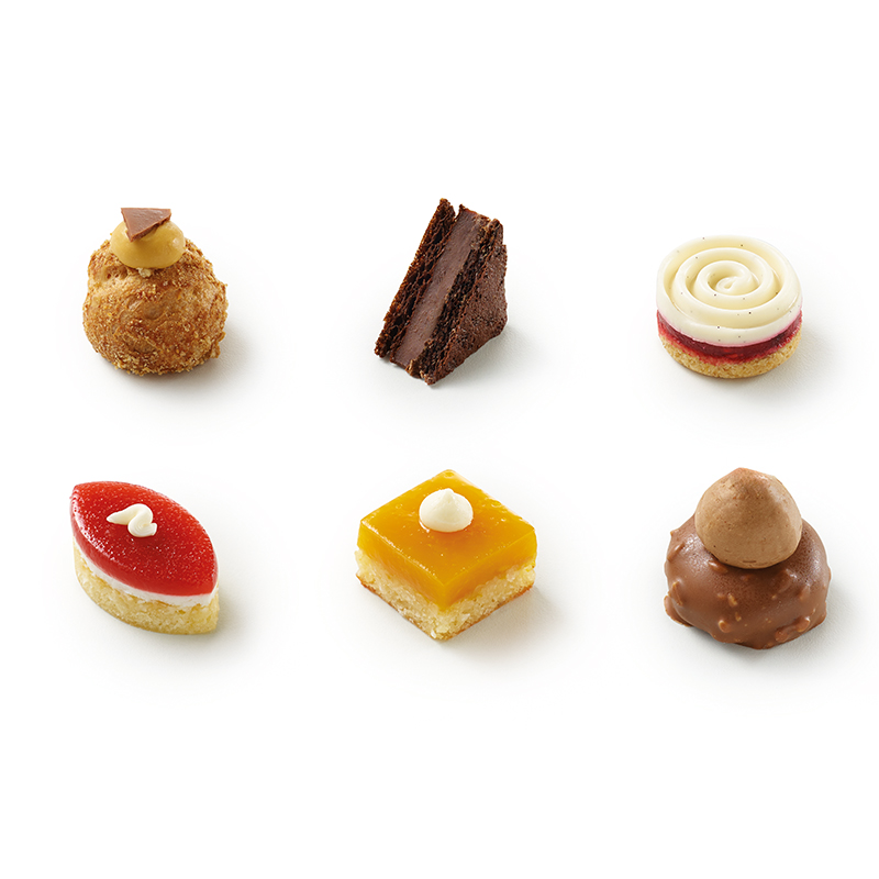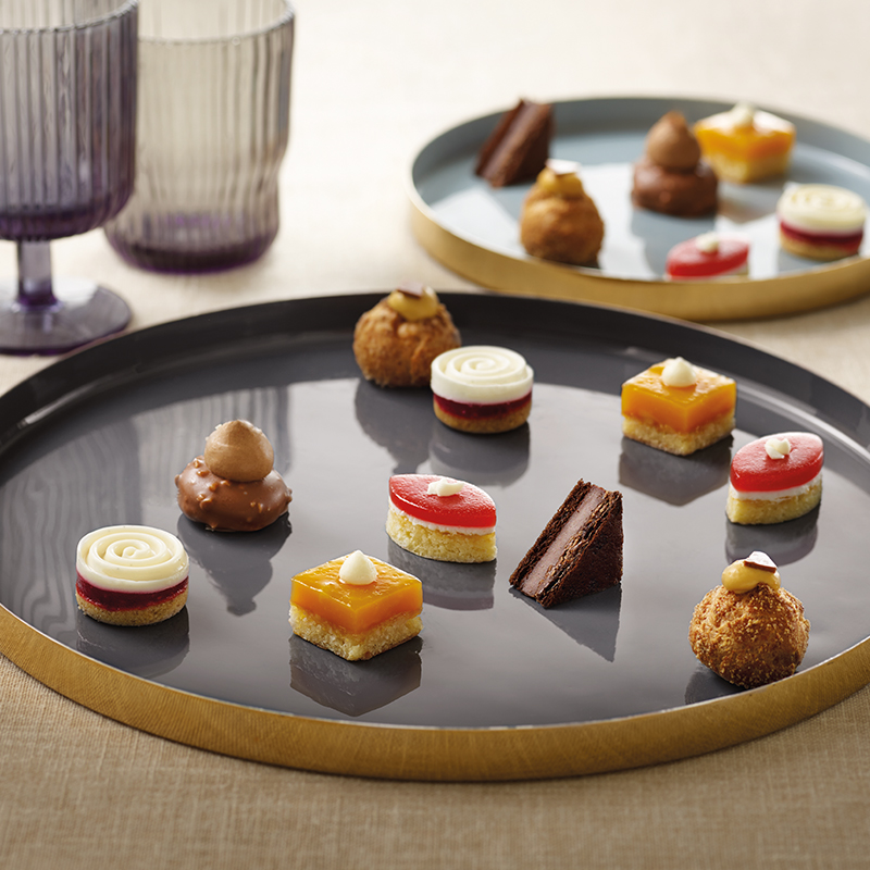 Caramel choux bun, vanilla and raspberry spiral or chocolate praline Merveilleux, these recipes bridge the gap between tradition and modernity. This tray of sweet Art Deco Petits Fours is available in Food Service and Cash and Carry format.