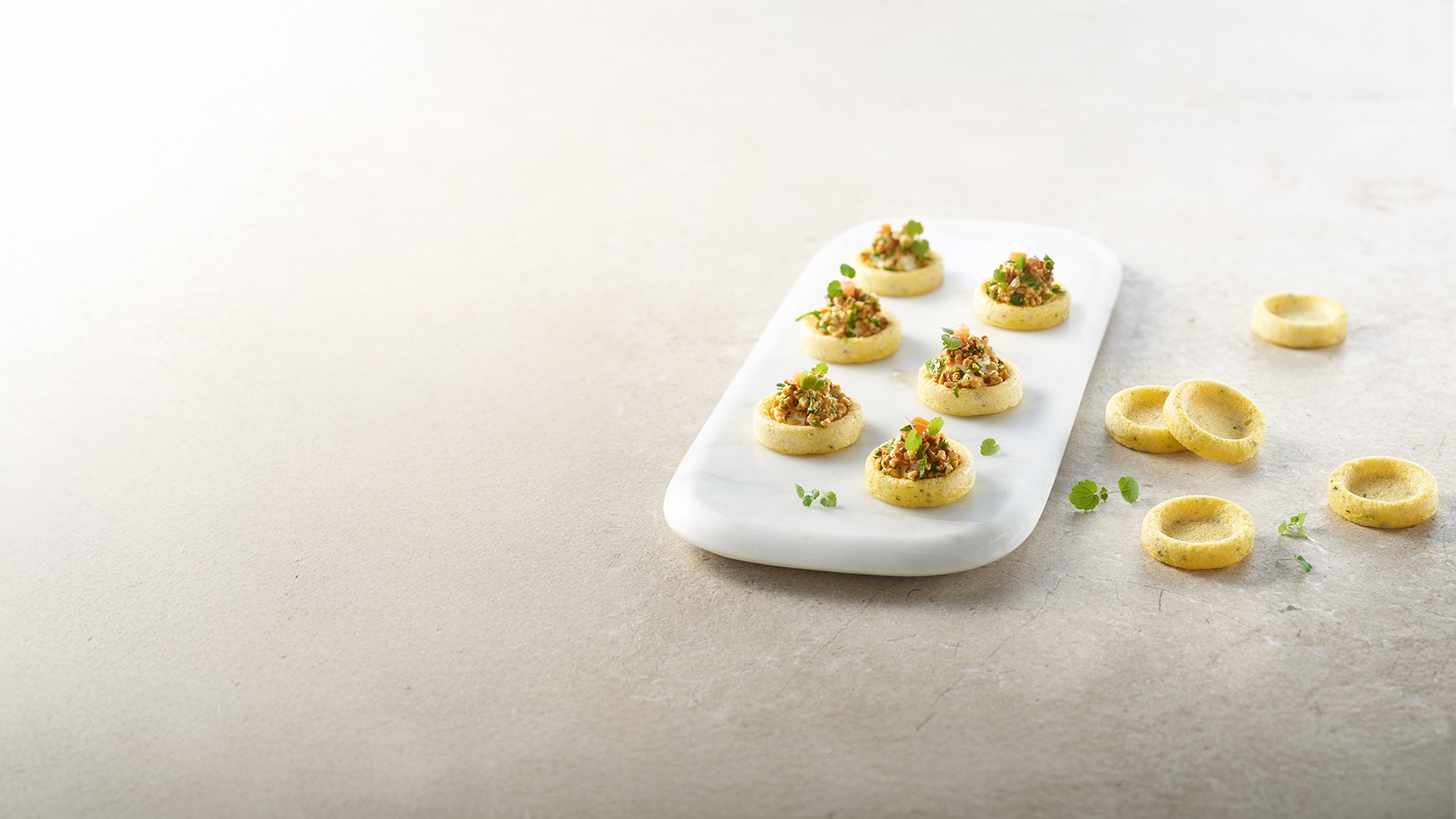 Mini Plain Polenta provides an ideal base for effortlessly creating generous, flavourful canapé bites. Their 10 g format becomes a two-bite piece once filled, making them perfect for buffets, drinks receptions or Functions.