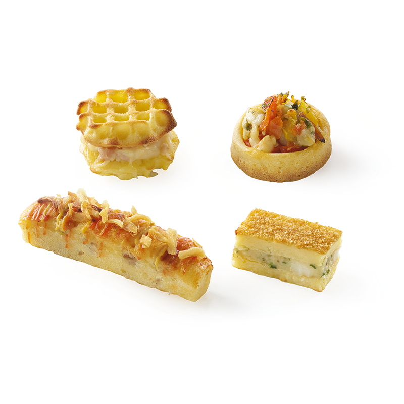 • 10 Mini Croq’ waffles: potatoes, smoked cooked ham, Comté PDO cheese and grated Emmental