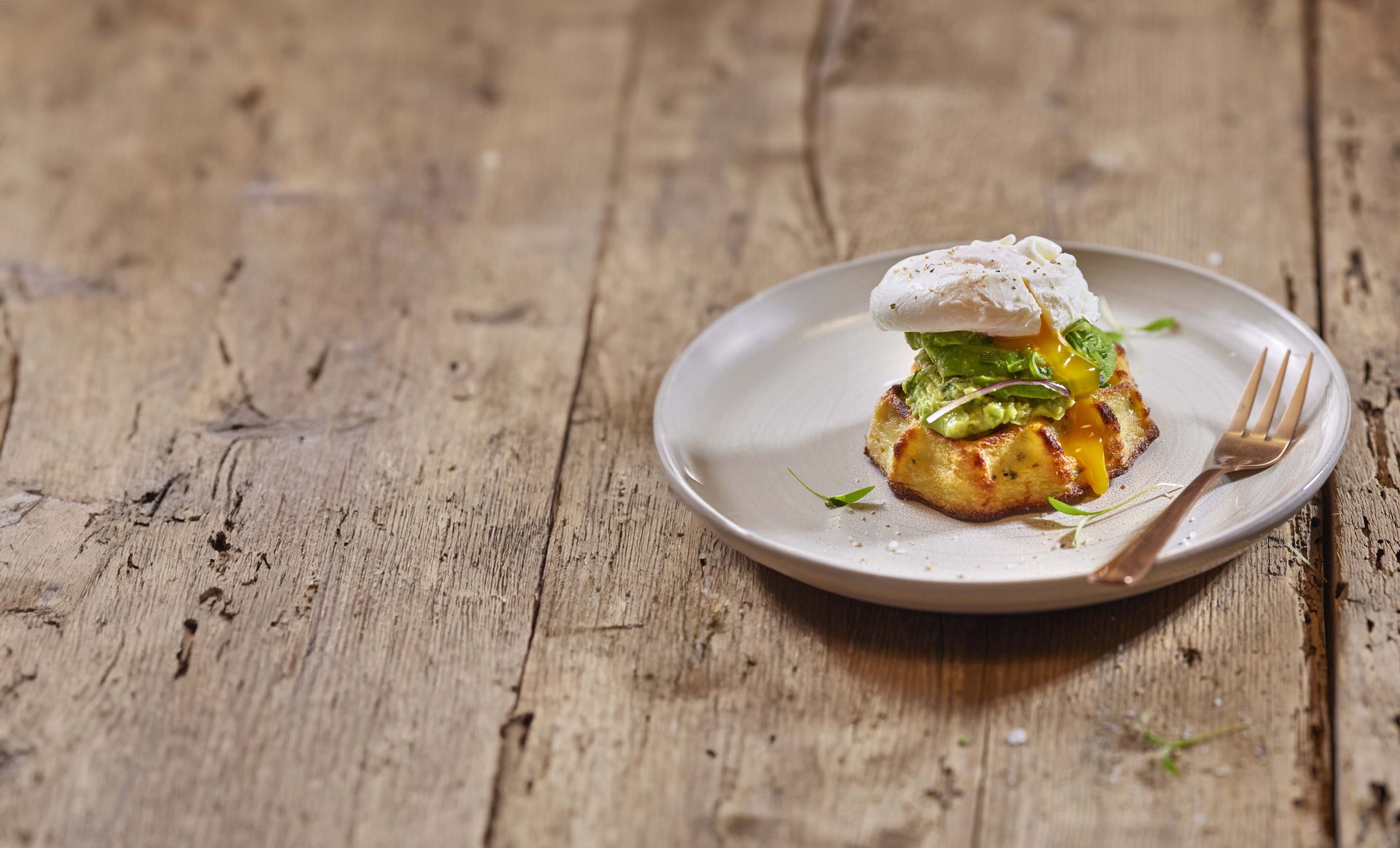 Arrange the waffle on the plate and top with a spoonful of fresh guacamole.