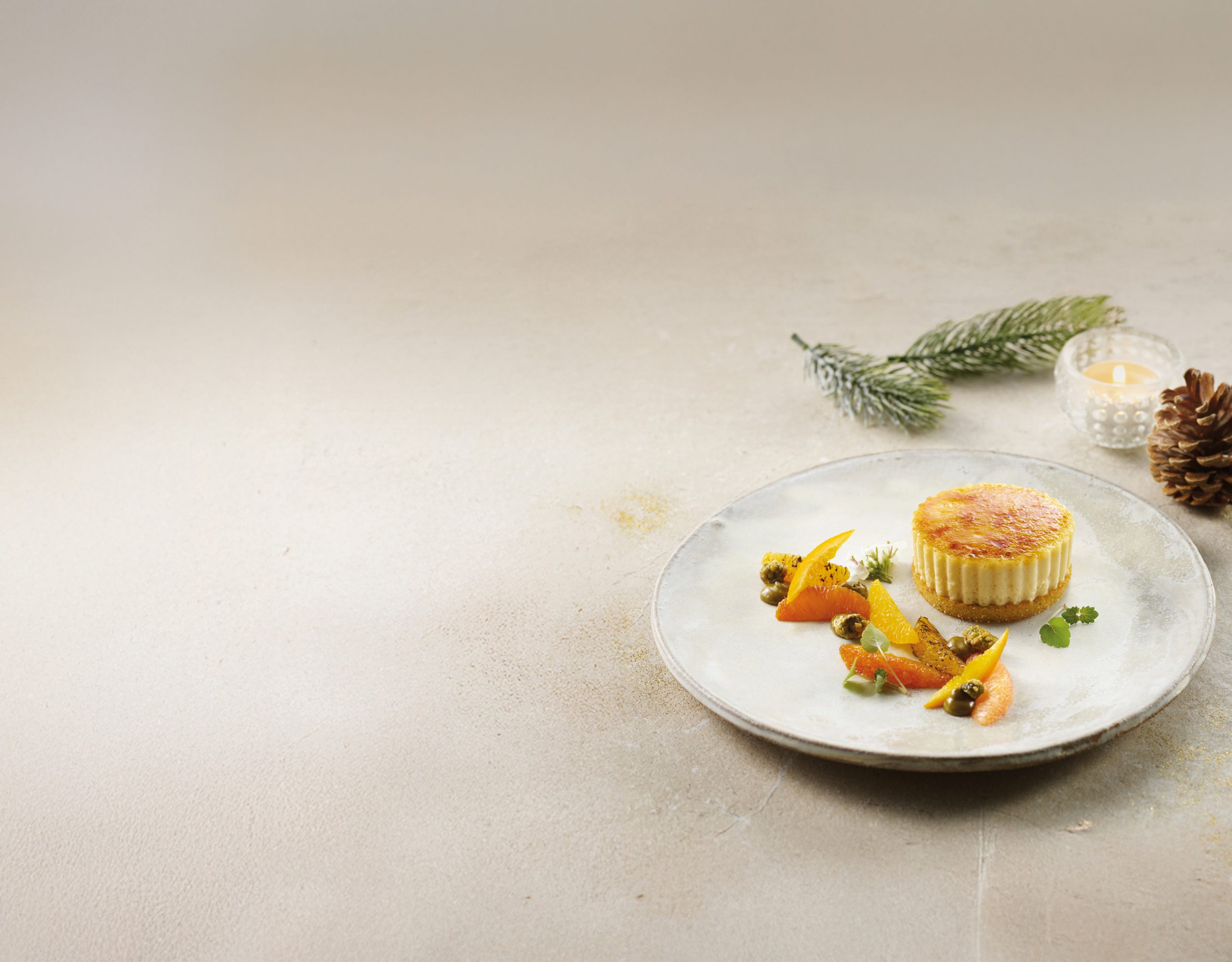 Traiteur de Paris > Recipe Inspiration > Festive Recipes > Recipe – Crème Brûlée Delight – Citrus supremes and caramelized pistachios