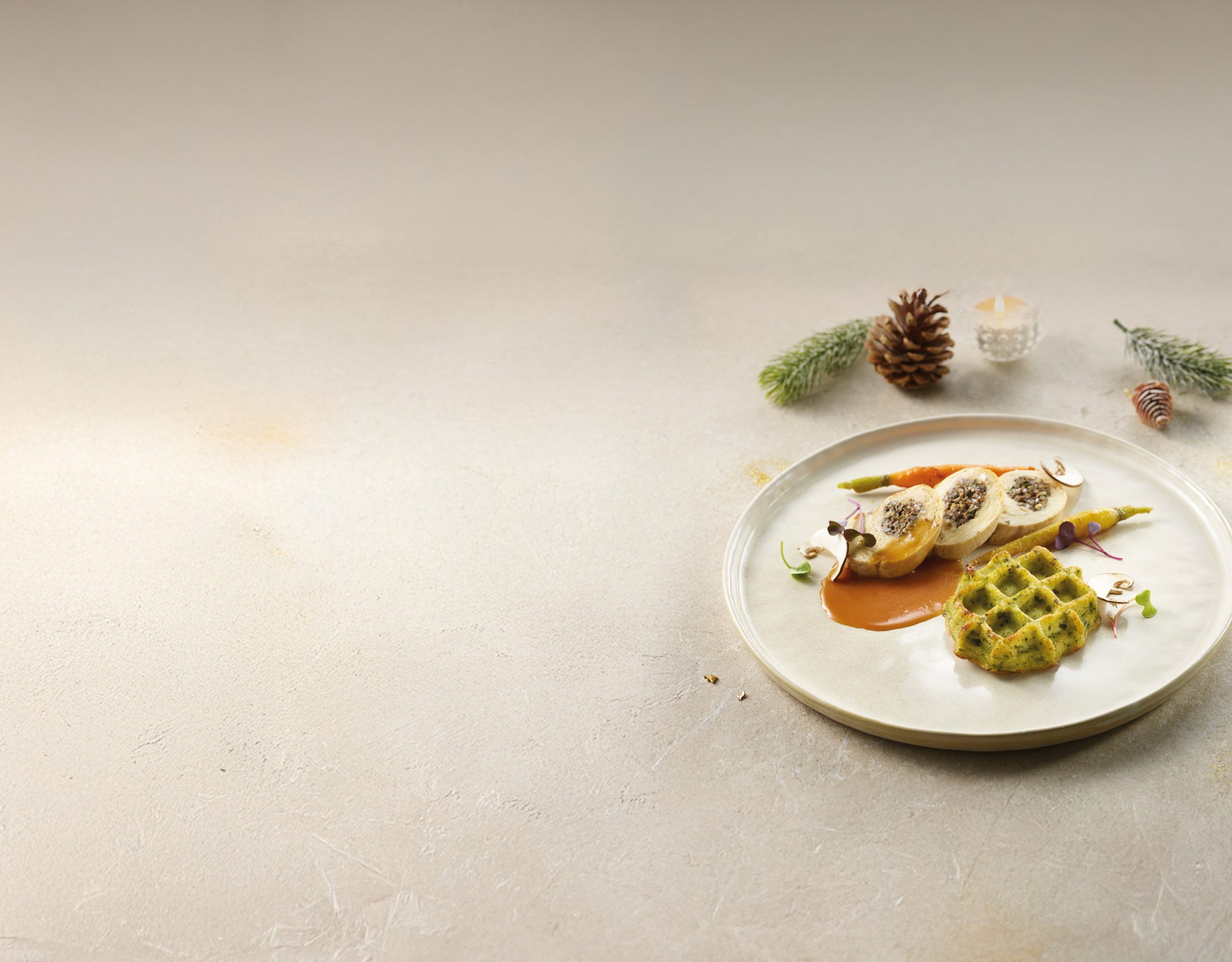 Traiteur de Paris > Recipe Inspiration > Festive Recipes > Recipe – Vegetable Waffle, Guinea fowl medallion with mushrooms